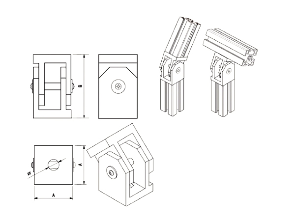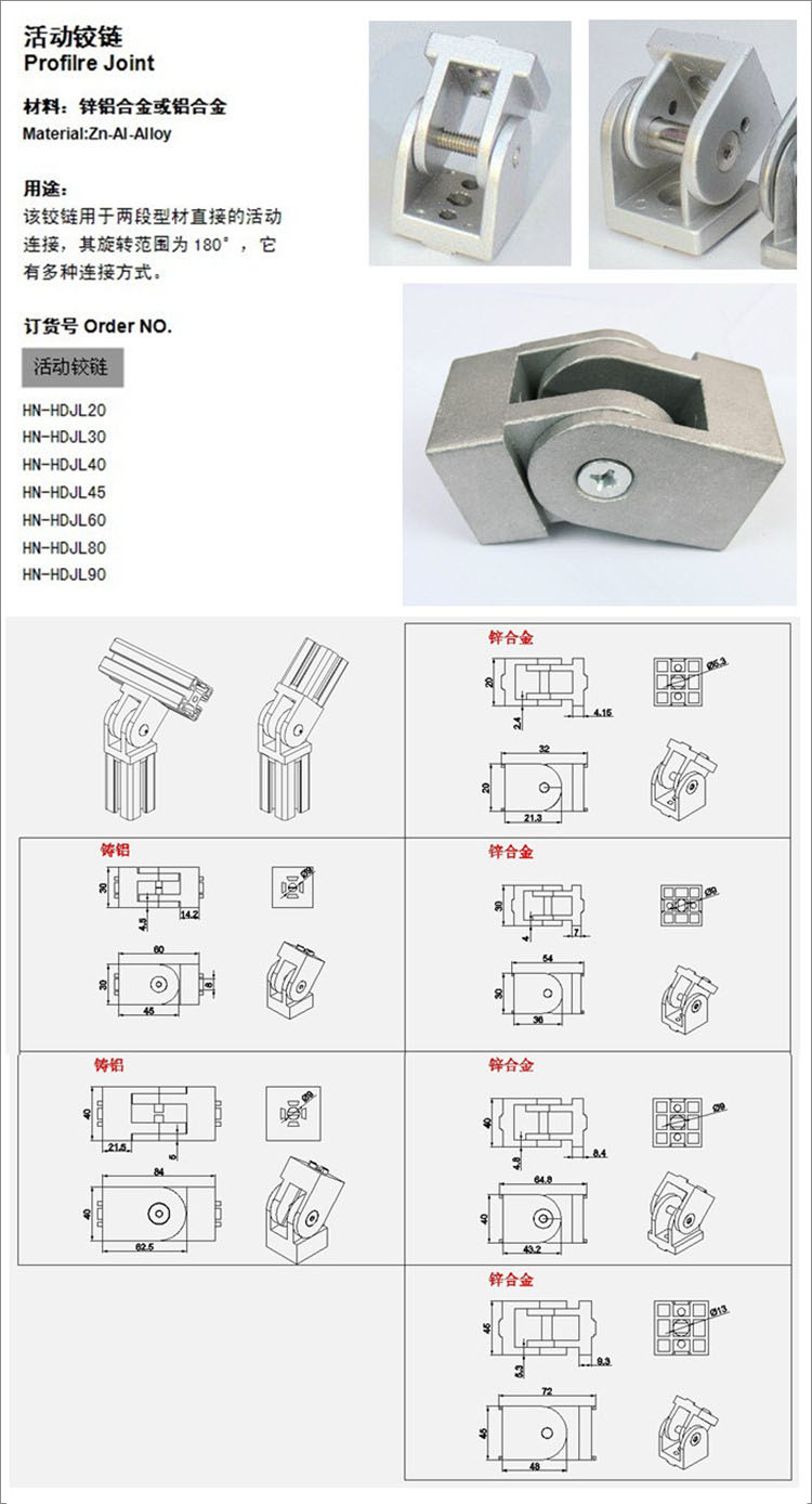 材料:鋅鋁合金或鋁合金 用途:該鉸鏈用于兩人段型材之間的活動(dòng)連接,其旋轉(zhuǎn)范圍為180度,它有多種連接方式。 型材:30X30 HN30、40X40 HN40、45X45 HN45