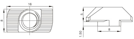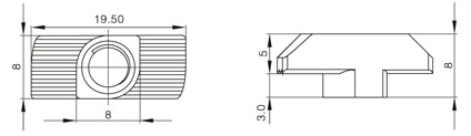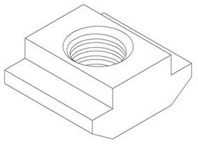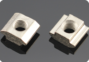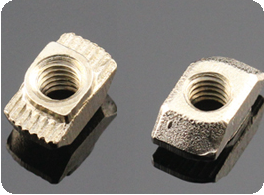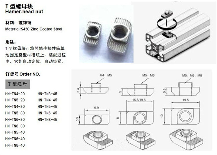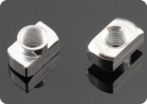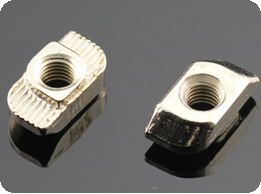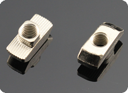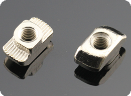 T型螺母:又名錘形螺母,在裝配的時候可由型材外部直接放入槽內(nèi),旋轉(zhuǎn)90度即可自動鎖緊定位。安裝極為方便,是工業(yè)鋁型材系統(tǒng)中最為常用的配件之一。