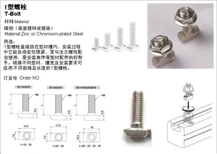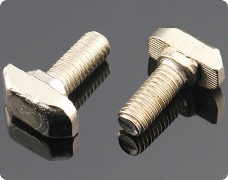 T型螺栓:又名錘頭螺栓,在裝配的時(shí)候可由型材外部直接放入槽內(nèi),旋轉(zhuǎn)90度即可自動(dòng)鎖緊定位。安裝極為方便,是工業(yè)鋁型材系統(tǒng)中最為常用的配件之一。